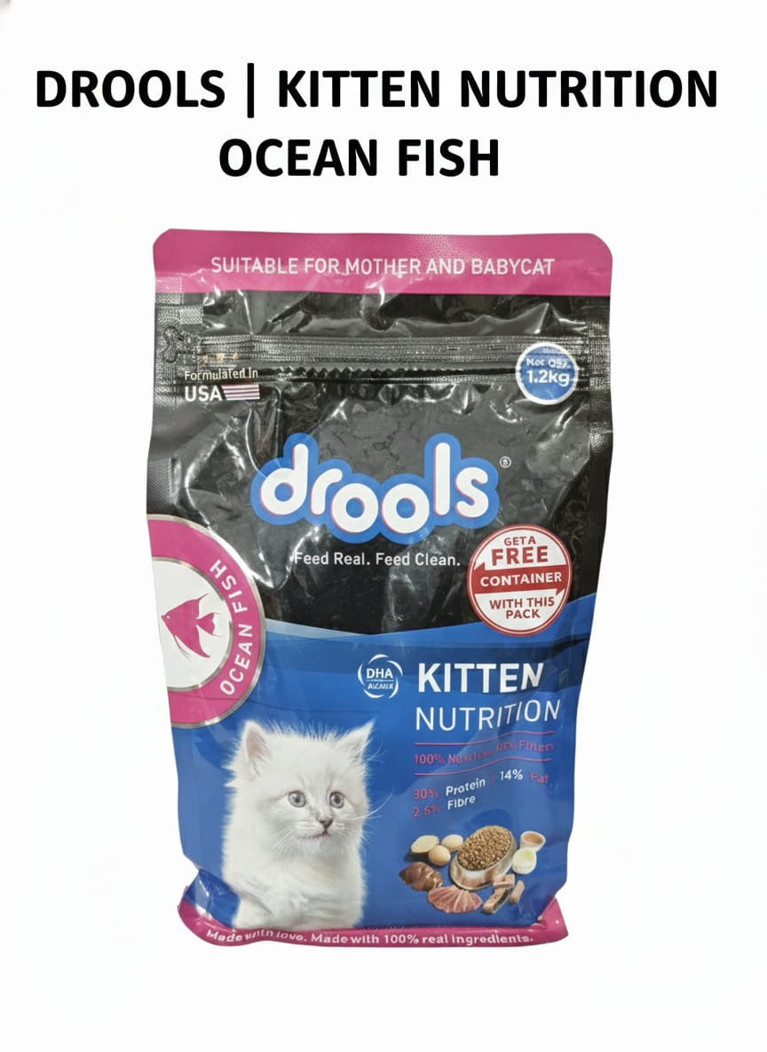 Give your kitten the right start with Drools Kitten Nutrition Ocean Fish Dry Cat Food. Specially made for growing kittens and mother cats, this formula provides balanced nutrition with high-quality protein and essential nutrients. Enriched with DHA and real ocean fish, it supports healthy growth, brain development, and a shiny coat.